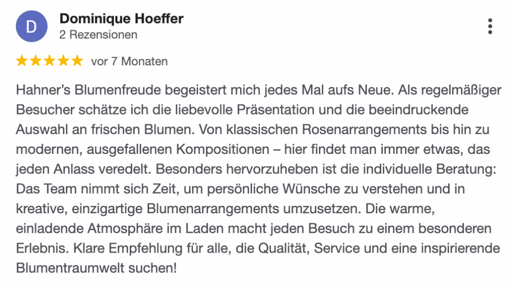 Ausgebildete Floristinnen mit langjähriger Erfahrung. Täglich frische Blumen von Erzeugern & Großhandel, liebevoll verarbeitet – keine Massenware, sondern individuelle Floristik, die zum Anlass und zur Location passt.